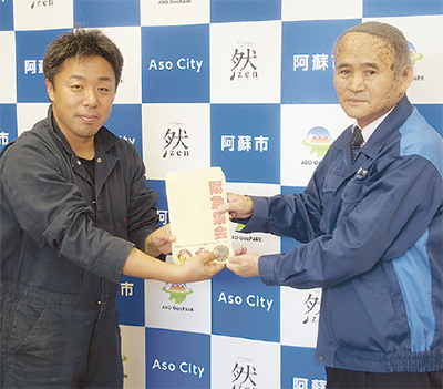 大和市内のバイクチーム「ピエロ」(代表・加藤誠一さん)とロックバンド「ブラックシャドー」(代表・ジムさん)が先ごろ、市内のレストランで熊本地震復興のチャリティライブを開催。大和市議会議員の古谷田力さんが10月17日、熊本県の阿蘇市役所を訪れ、ライブ会場で集まった義捐金30万3269円を宮川清喜副市長に手渡した。