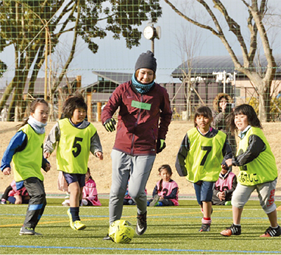 「大和なでしこサッカーフェスティバル」が1月14日、福田の大和ゆとりの森・大規模多目的スポーツ広場を会場に開催された。今回は、元なでしこジャパンの海堀あゆみさんと永里亜紗乃さんらが講師を務め、子どもたちなど参加者とのサッカーを楽しんだ。