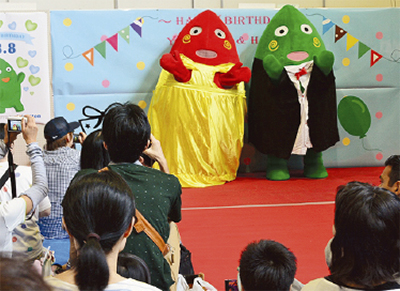 ヤマトンは8月8日、ハートンは10日生まれ。当日は、タキシードやドレスなどを着た両キャラクターが登場すると、約280人の参加者は声をかけたり、写真に収めたりしていた。