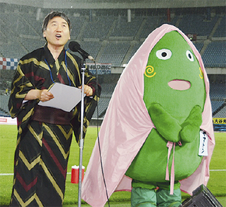 試合前には大木哲市長が観客席に向かってあいさつし、「これからはより一層強くなった絆で、横浜F・マリノスを全力で応援します」と話した。