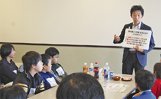 食育講座の講師を務めたのは、「自然食品の店ヘルスロード」(市内中央)店長の三浦高義さん。「食を通じて力強く走るための3つのポイント」と題し、ランナーたちに食の大切さを伝えた。