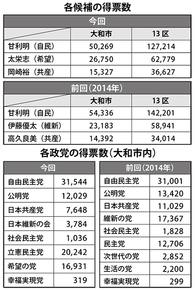 小選挙区での甘利氏の得票率は、6割を超えた前回(2014年、60・47%)には及ばないものの56%を超える高いもの。市内だけを見ても54・4%と2回続けて50%を超えた。甘利氏が減らした票が太、岡崎両氏に流れたが、過半数を超えることはなく、仮に「野党共闘」が実現し、候補者を一本化しても、ゆるぎない結果となった。