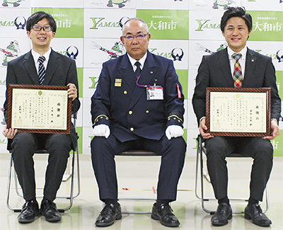 大和市消防本部(萩野谷公一消防長)は11月10日、パチンコ店「ドキわくランド大和駅前店」の喜世友希副店長(31)と布施龍一さん(29)に、人命救助の協力に対し感謝状を贈呈した。