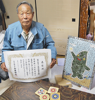 この表彰は、職業能力開発の推進を図るため、「人材開発促進月間」に当たる11月に職業訓練、技能検定、技能振興に関して顕著な貢献があった事業所などを対象に毎年実施されているもの。タイル貼りの国家資格を持つ県内の技能士からなる同会は、子ども向けのものづくり体験教室や職業体験、技能コンクールに積極的に取り組んできたことが評価され、今回の表彰となった。中島会長は「技能振興での団体表彰は全国で2団体しかなかったので、とても誇らしく嬉しい」と賞状を手に喜びを話す。