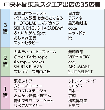 公共施設スペース以外では、全面改装される東急ストアのほか、雑貨や衣料品、サービステナントなど35店舗が出店。内外装も街並みに溶け込むことをめざし、ナチュラルな素材感を生かしたデザインとなる。