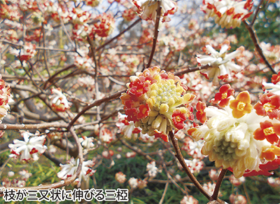 羽衣のように降り注ぐ柔らかな春の陽を受け、赤や黄色の気品高い花を咲かせる三椏(みつまた)。花のお寺「常泉寺」では、参道から境内いっぱいに約250本ある三椏が見頃を迎えた。「かながわ花の名所100選」に選定され、平地で咲く三椏としては日本一。辺りは芳香に包まれ、身体全体を通して春を味わおうと遠方からも参拝者が訪れている。