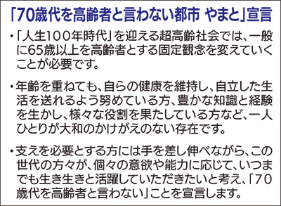 宣言では、「人生100年時代」を迎える超高齢社会の到来を見据え、65歳以上を高齢者とする固定観念を変えていくことが必要と定義。70歳代の人たちが、個々の意欲や能力に応じて、いつまでも生き生きと活躍してもらうためのものであるとしている。