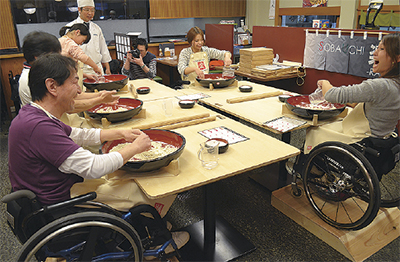 車いす利用者でも楽しくそば打ち体験を―座高調整や体重をかけての作業などが多く、車いす利用者にとってハードルの高いそば打ちを、利用者に体験してもらう催しが4月10日、西鶴間増田屋を会場に開催された。