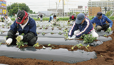 大和市の推奨品になっている芋焼酎『和み』の原料となる紅あずまの苗植えが10日、国道246沿いの農地で行われた。