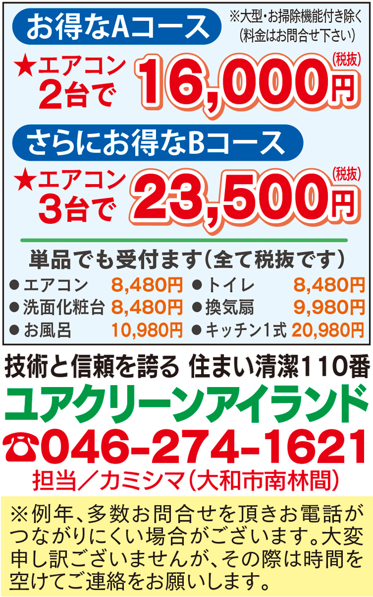 そこでお勧めなのがプロのクリーニング。技術と信頼で定評のある地元有名店『ユアクリーンアイランド』では、素人の手が届かない部分も徹底的に丸洗い。冷却効率を上げ、節電にもなる。「中途半端な掃除ではカビはすぐ復活する為プロにお任せを。大型、掃除機能付の料金は問合せ下さい」