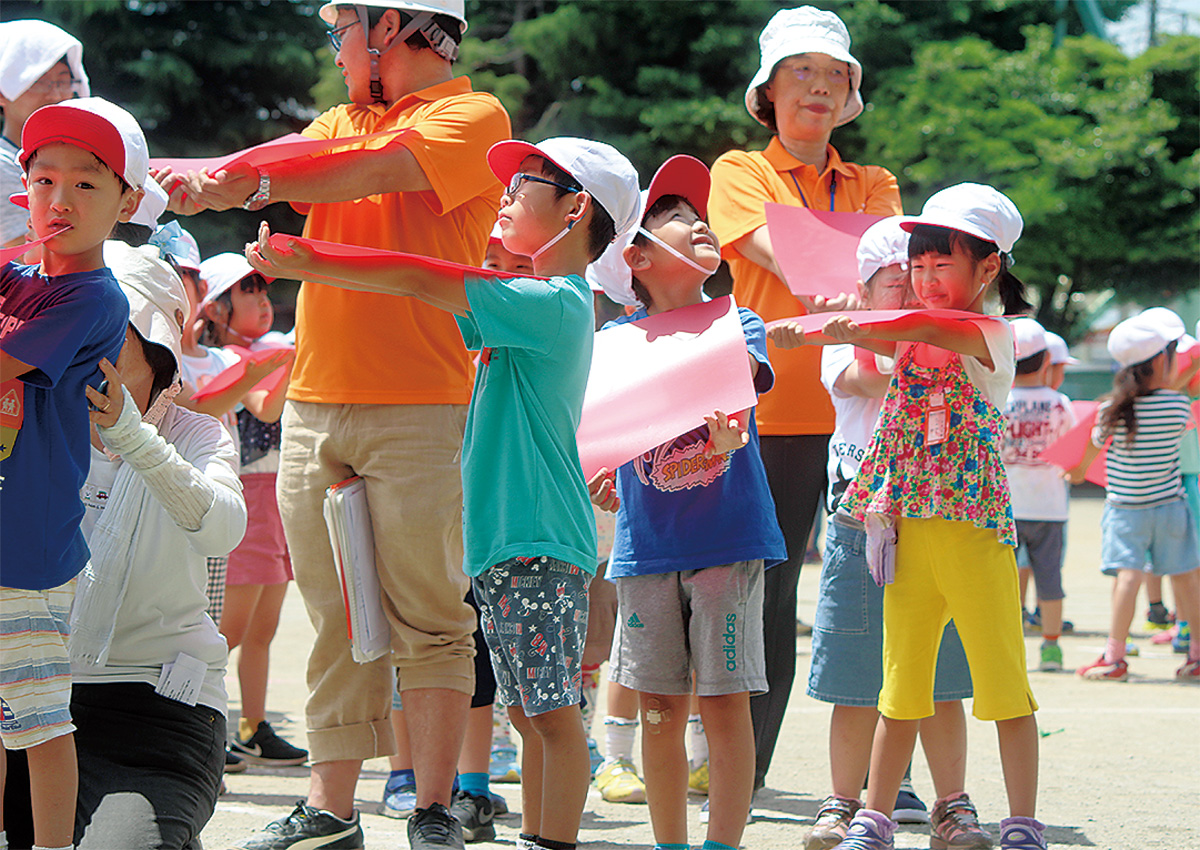 児童たちは校庭に描かれた図案を囲むように整列。「飛行機がきましたー」の合図で、伸ばした両手に赤、青、ピンクのカラーボードを乗せ、撮影に臨んだ。この日撮影した写真はクリアファイルなどに印刷され、児童たちに配布される予定。