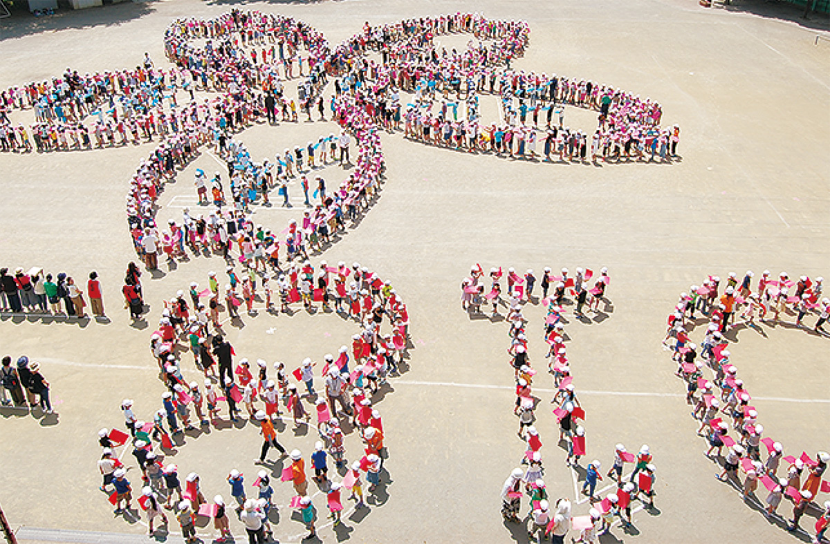 人文字のデザインは、全校児童から募集。作品数を絞り、児童たちの投票で、2年生の山室凛さんの図案に決定した。