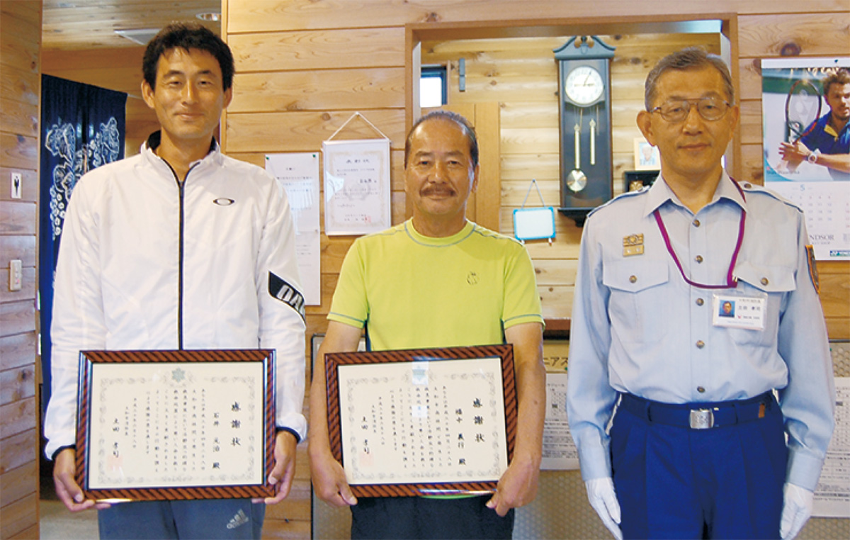 南林間テニスクラブ支配人の石井元治さん(34)と会員の福中義行さん(66)が同クラブ敷地内で倒れた74歳の男性を救助したとして、土田孝司消防長から感謝状を贈呈された。男性は既に退院して、後遺症もなく生活できている。