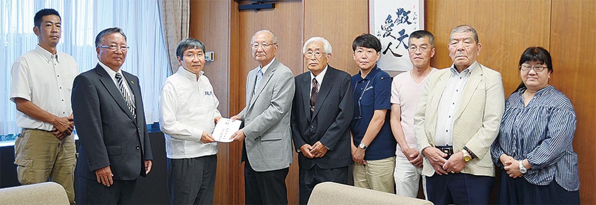 駒形会長らは29日、市役所を訪問し、集まった約12万円の義援金を日本赤十字社神奈川県支部大和市地区(地区長・大木哲市長)に手渡した。