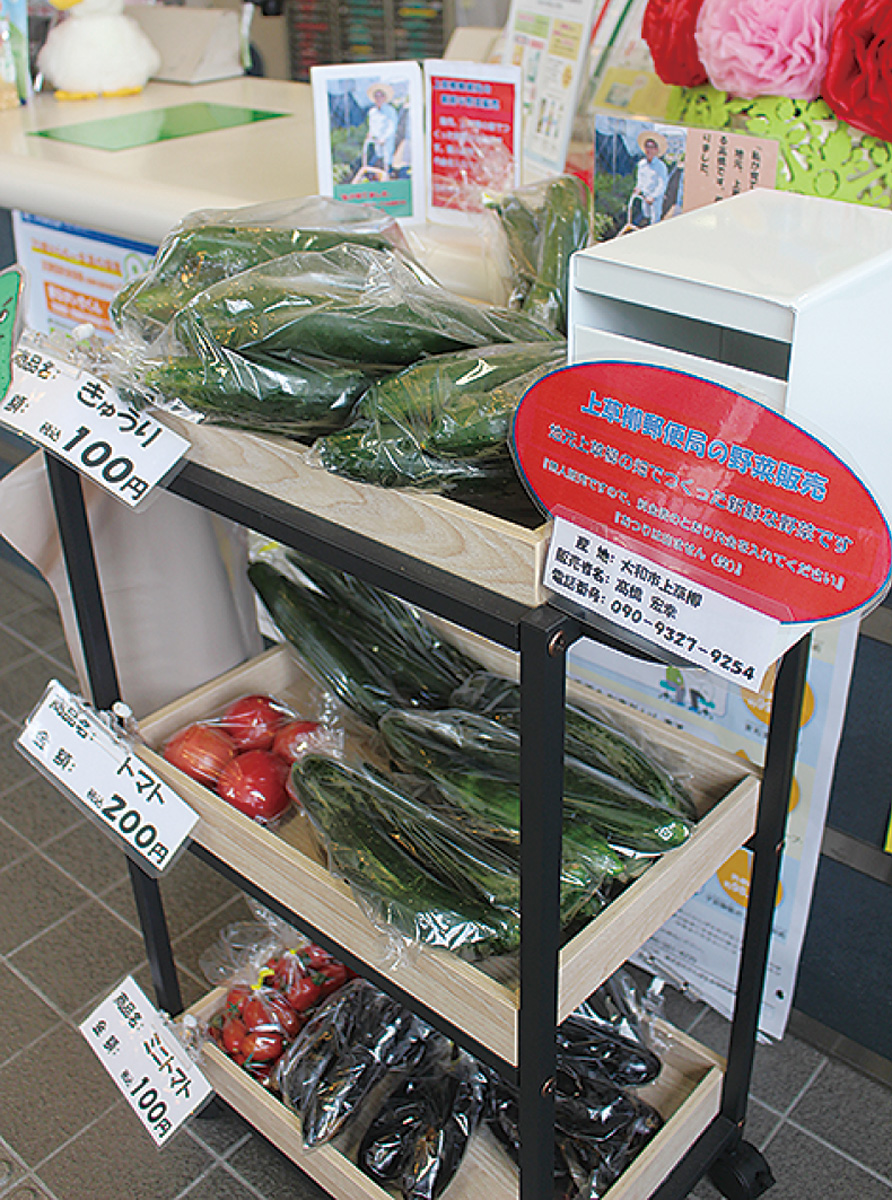 市内郵便局の窓口でこの夏から、朝採れ野菜の直売が始まっている。
