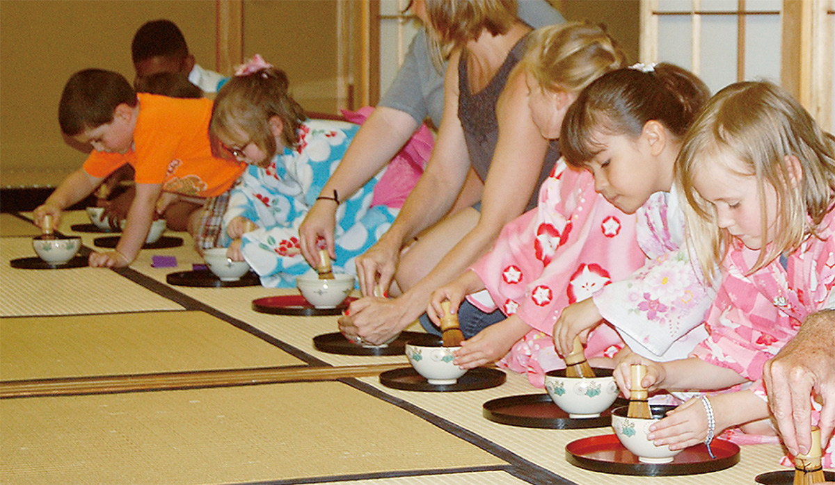 広間席の体験では、日米の児童がペアを組み、互いにもてなした。シャーリーランハム小学校には日本文化を学ぶ授業があるため、手つきや作法は日本人顔負け。上手に点てた抹茶を差し出していた。