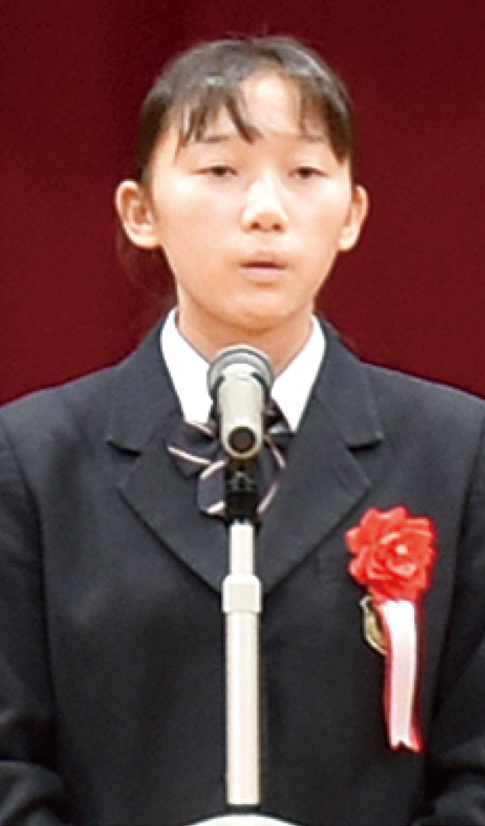 小学5年生、中学2年生、高校2年生が応募対象の作文は、各学年代表1人が自分の作品を朗読。柏木学園で短歌書道部に所属する中村優奏(はるか)さん=写真=は、夏休みの全国大会を前に部員たちと切磋琢磨した様子を臨場感あふれる筆致でしたため、暗唱。「先生からも良かったよ」とほめてもらったと笑みを零した。