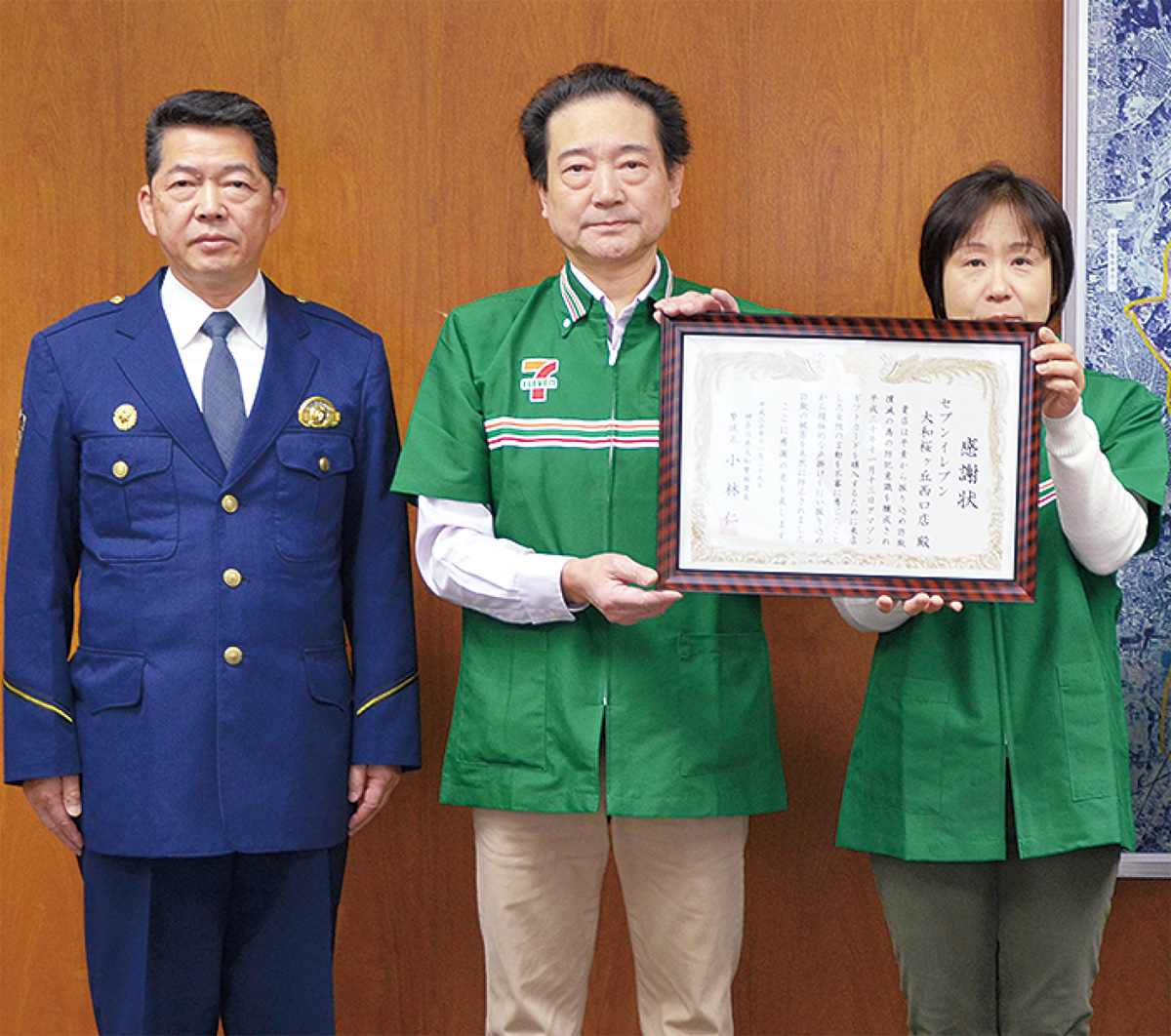大和警察署(小林仁署長)は11月29日、架空請求による詐欺被害を未然に防いだとして、セブンイレブン大和桜ヶ丘西口店の吉田栄子さんとオーナーの菊地利充さんに感謝状を贈った。