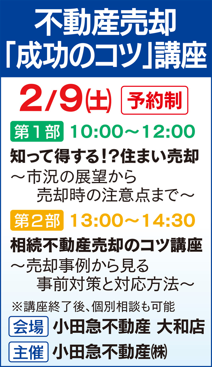 第一線で活躍する現場の営業マンによる不動産に関する「知って得する」情報盛りだくさんの講座が、2月9日(土)に開催される。会場と主催は、昨年12月にリニューアルオープンした小田急マルシェ大和内の小田急不動産(株)大和店。