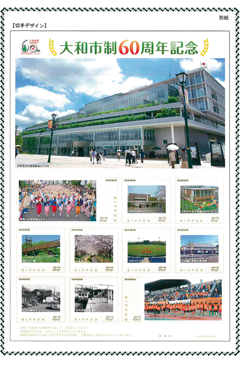 市制60周年を記念し、日本郵便株式会社南関東支社(川崎市川崎区/清水不二雄支社長)は、2月1日から大和市制60周年記念オリジナルフレーム切手=写真左=を販売する。記念フレームは、10年前の市制50周年以来。