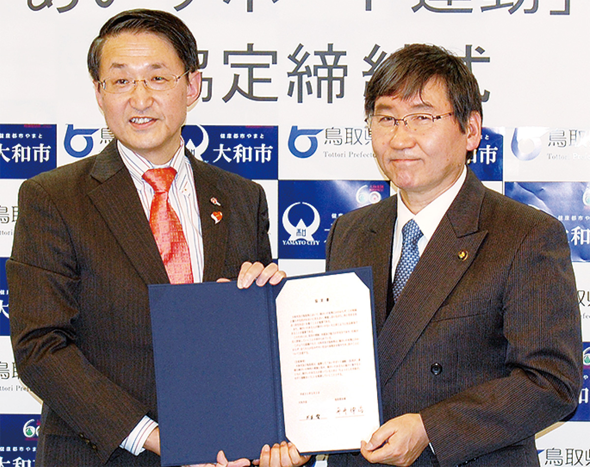 1日に行われた締結式では、平井伸治鳥取県知事が大和市役所を訪問し、大木哲市長と協定書に署名した。大木市長は「鳥取県のノウハウを学び、一人でも多くの人が障害福祉に関心を持つことを願う」とあいさつ。平井知事は「大和市が60周年の節目に運動に参加してもらったことは意義深い。これを契機に、これからも鳥取県とさまざまな福祉政策を共有したい」と述べた。