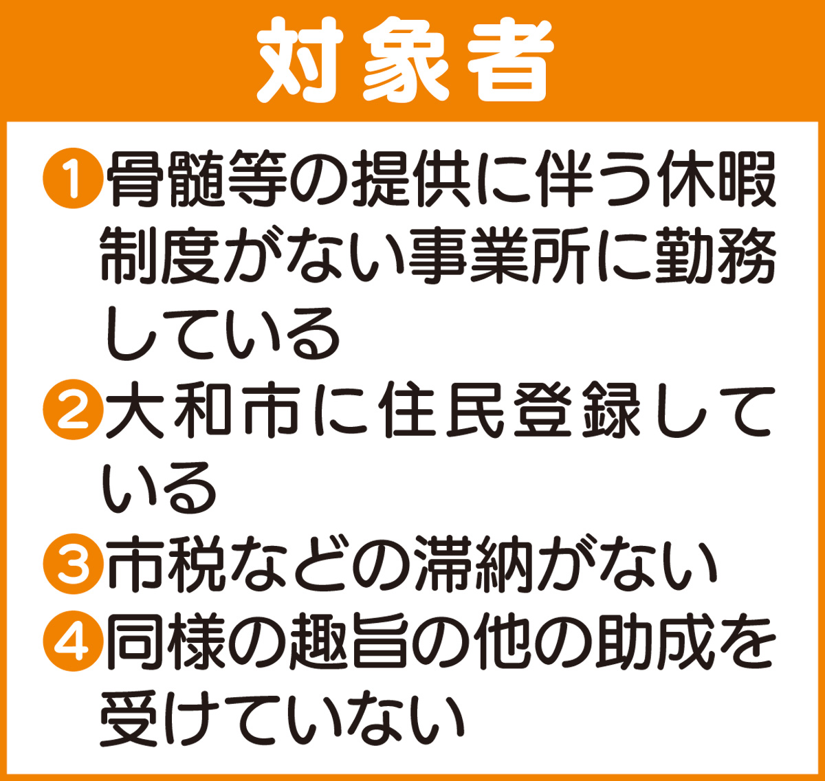 助成は市民で、市税の滞納がない、同様の助成を受けていない、骨髄等の提供に伴う休暇制度のない事業所に勤務している人で、健診や貯血のための通院、骨髄等採取のための入院などが対象となる。