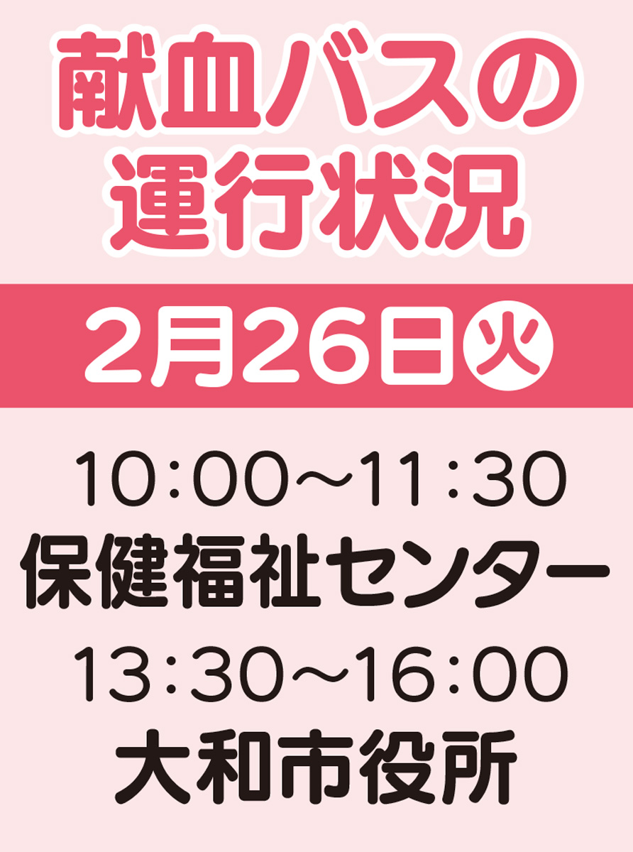 骨髄ドナー登録は、厚木保健福祉事務所大和センター(中央1の5の26)でも可能。登録実施日は奇数月の第4月曜日で次回は3月25日(月)。予約制で、登録希望者は前週の金曜日の午前中までに電話または来所で予約。