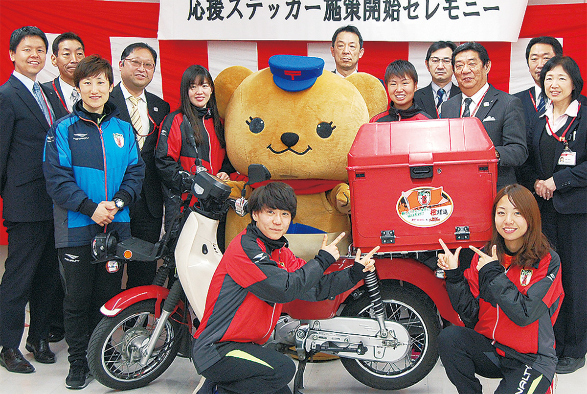 大和郵便局(亀口恒夫局長)で3月14日、二輪車140台に大和シルフィードの応援ステッカーが貼られ、式典が行われた。サッカーチームのステッカー貼付は県内郵便局で初の試みで、12月末まで継続される。