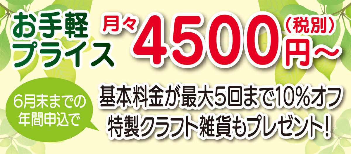 6月末までに年間申込をすると、2回目以降の基本料金を最大5回(半年間)まで10%オフ。さらに同社特製クラフト雑貨も進呈。気軽に【電話】を。