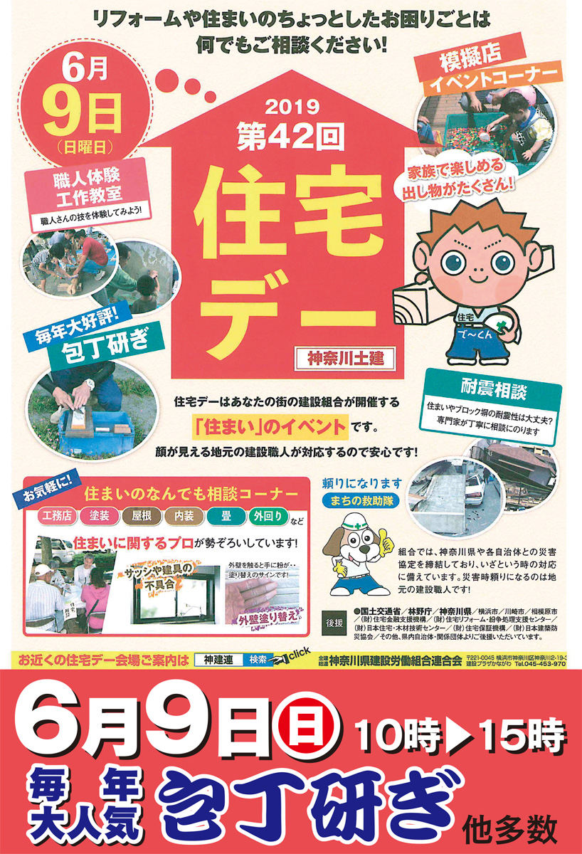 県下最大の建設労働組合である神奈川土建の「第42回住宅デー」が、6月9日(日)県内いっせいに開催される。大和市内では6会場で、午前10時から午後3時まで。