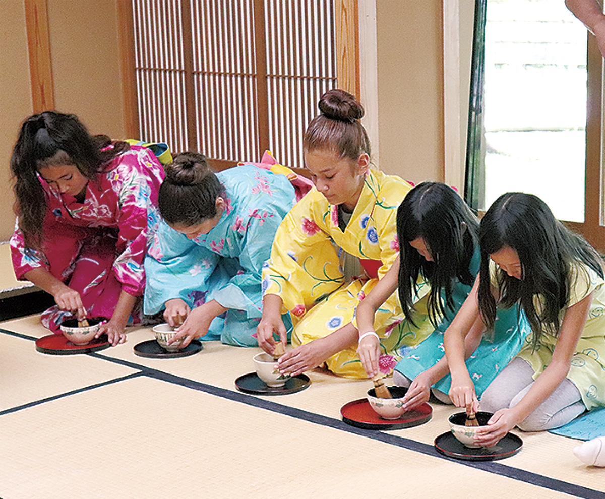 同体験は、市内の茶道会「大和みどり会」(岩本宗翠会長)が主催する恒例行事。両校の児童は、自分たちで点てたお茶を互いに振る舞ったり、英語で質問し合いながら交流を深めていた。