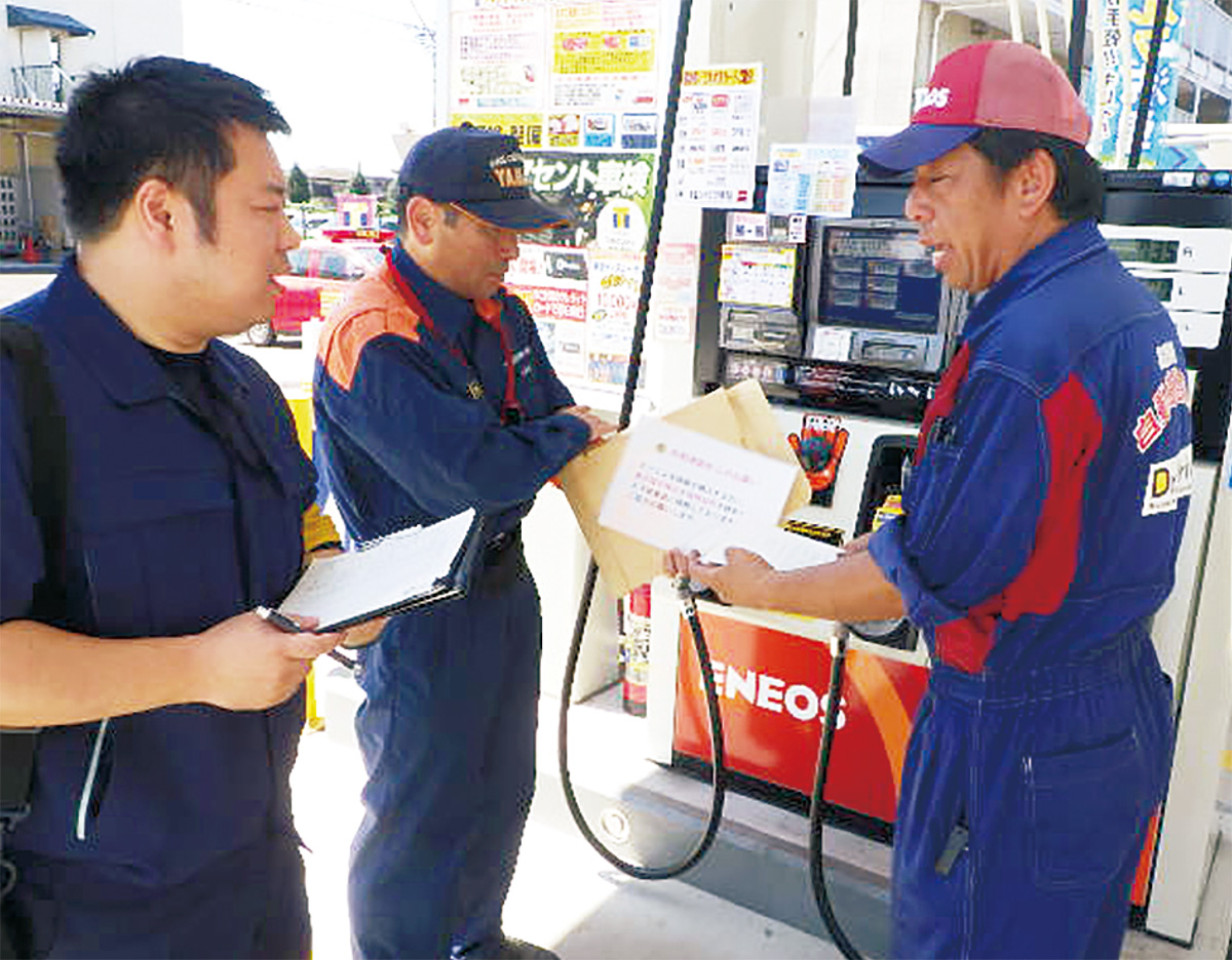 要請には、市消防本部予防課の職員2人に大和警察署の警察官1人が同行。携行缶へのガソリン販売の際、購入者に対して運転免許証など身分証明書の提示を求めるほか、住所や名前、販売量、使用目的を記録し残しておくこと、不審者発見時の速やかな通報などについて、依頼文を手渡ししながら丁寧に説明した。