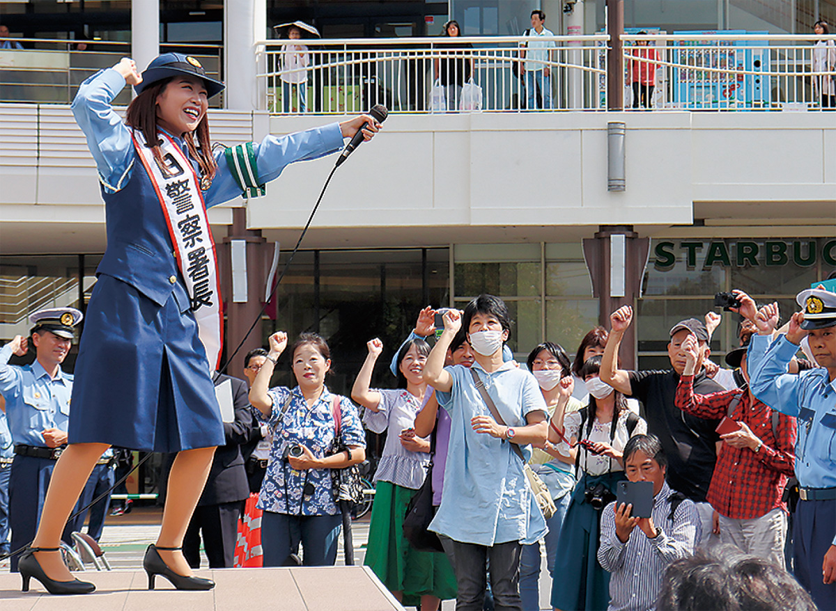 一日警察署長には、元SDN48の大山愛未さんが就任。自身が歌う神奈川県警の公式ソング「みんなで仲良くパトロール」を披露すると、会場に集まった関係団体の会員やファンは合いの手を入れて盛り上がった(=写真)。神奈川県警の白バイ隊は迫力のある模範走行も披露した。