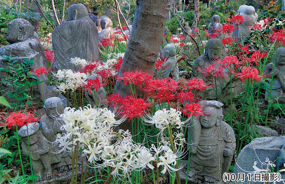 同寺は例年9月中旬に約5000本の彼岸花が石仏の間を縫うように咲く名所。しかし今年は、寒い日が続いた7月に一部が開花。一方で、9月は残暑が続き開花が進まなかった。青蔭住職は「ここまで開花が遅いことはない」と話した。すでに散り始めているので開花状況を問い合わせてからの訪問が確実。【電話】046・267・8789