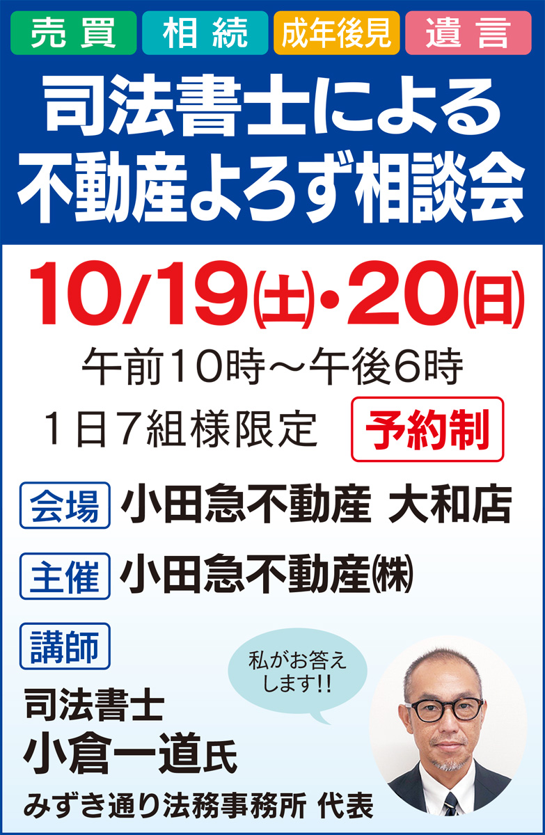 不動産や相続にまつわる疑問点をプロが解説する「司法書士による不動産よろず相談会」が、10月19日(土)と20日(日)に開催される。会場と主催は、小田急マルシェ大和内の小田急不動産株式会社大和店。