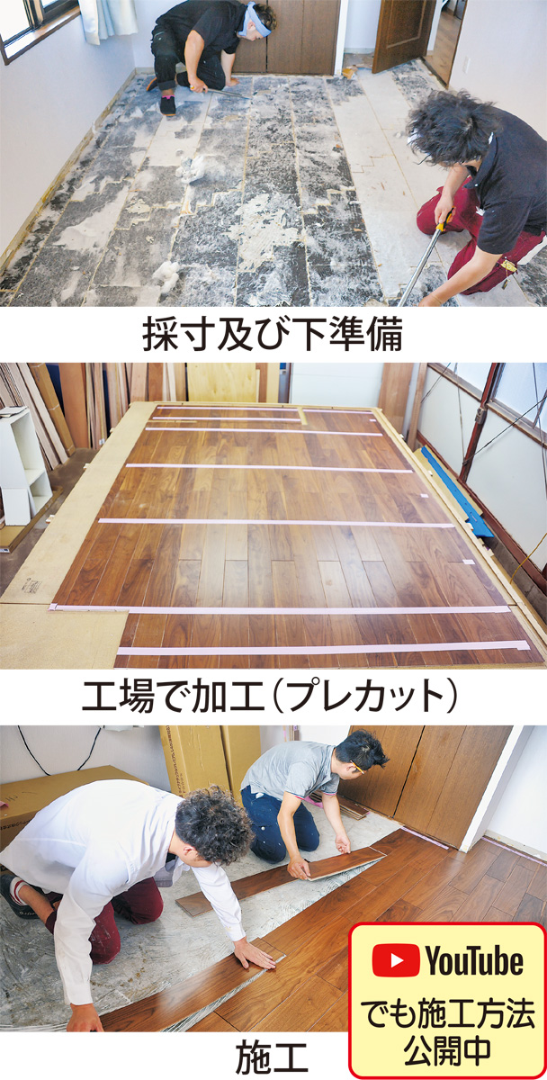 現在、このプレカットリフォーム工法は、フローリングで技術が確立されている。畳からフローリング、古いフローリングからのリフォームも可能。出入口の段差をなくすバリアフリーにも対応している。