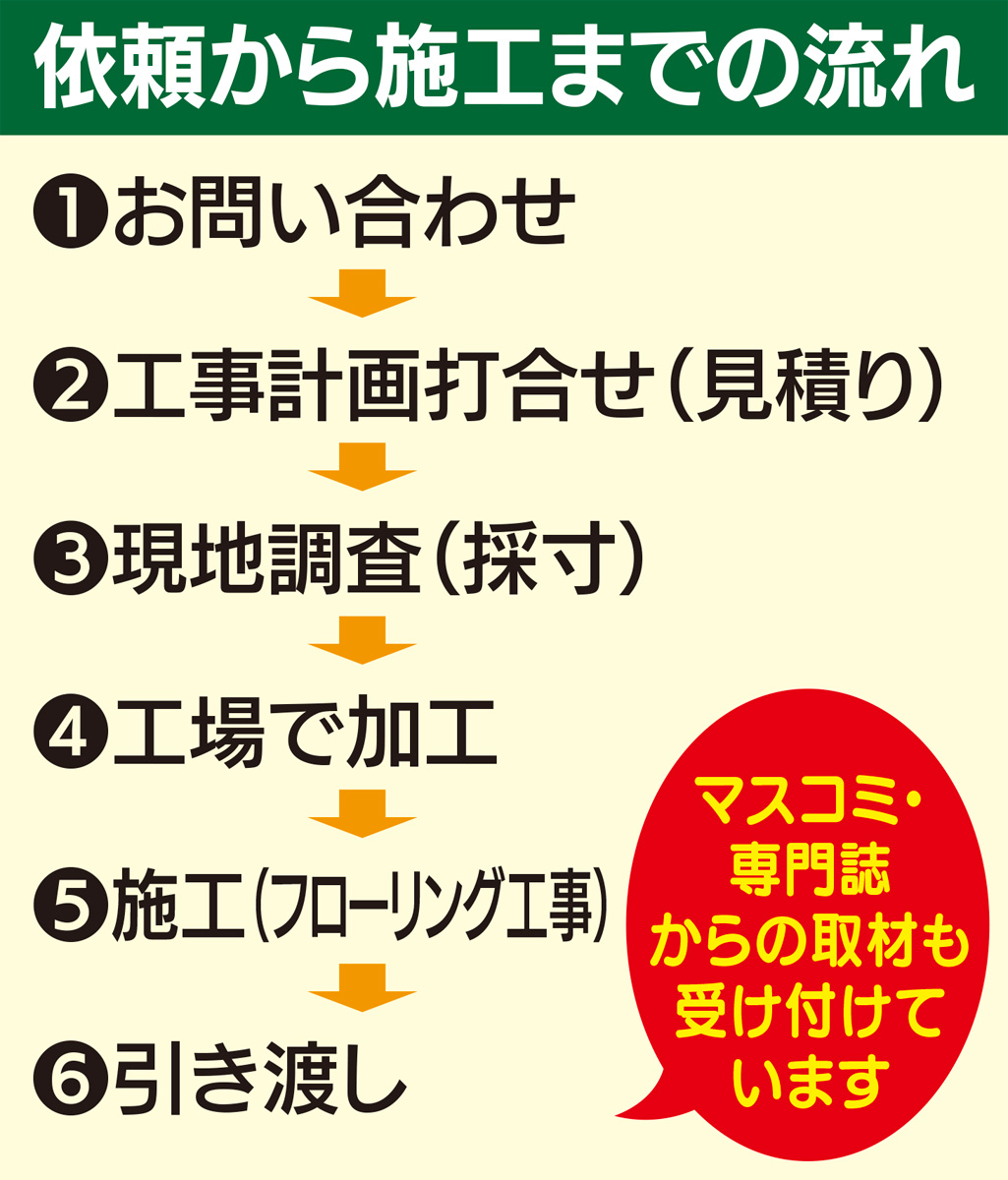 事前に加工するので工期が短縮できるのも特徴で、【1】採寸(工事なし/1時間ほど)→【2】工場で部材カット→【3】施工(1〜2時間)の3ステップ。採寸と施工をそれぞれ違う日に行うため、「火曜日しか時間が取れない」という人も、採寸と施工を3、4週間空ければ無理なくリフォームできる。また施工時間をしっかり管理できるため、日をまたいで施工することがないのも安心。