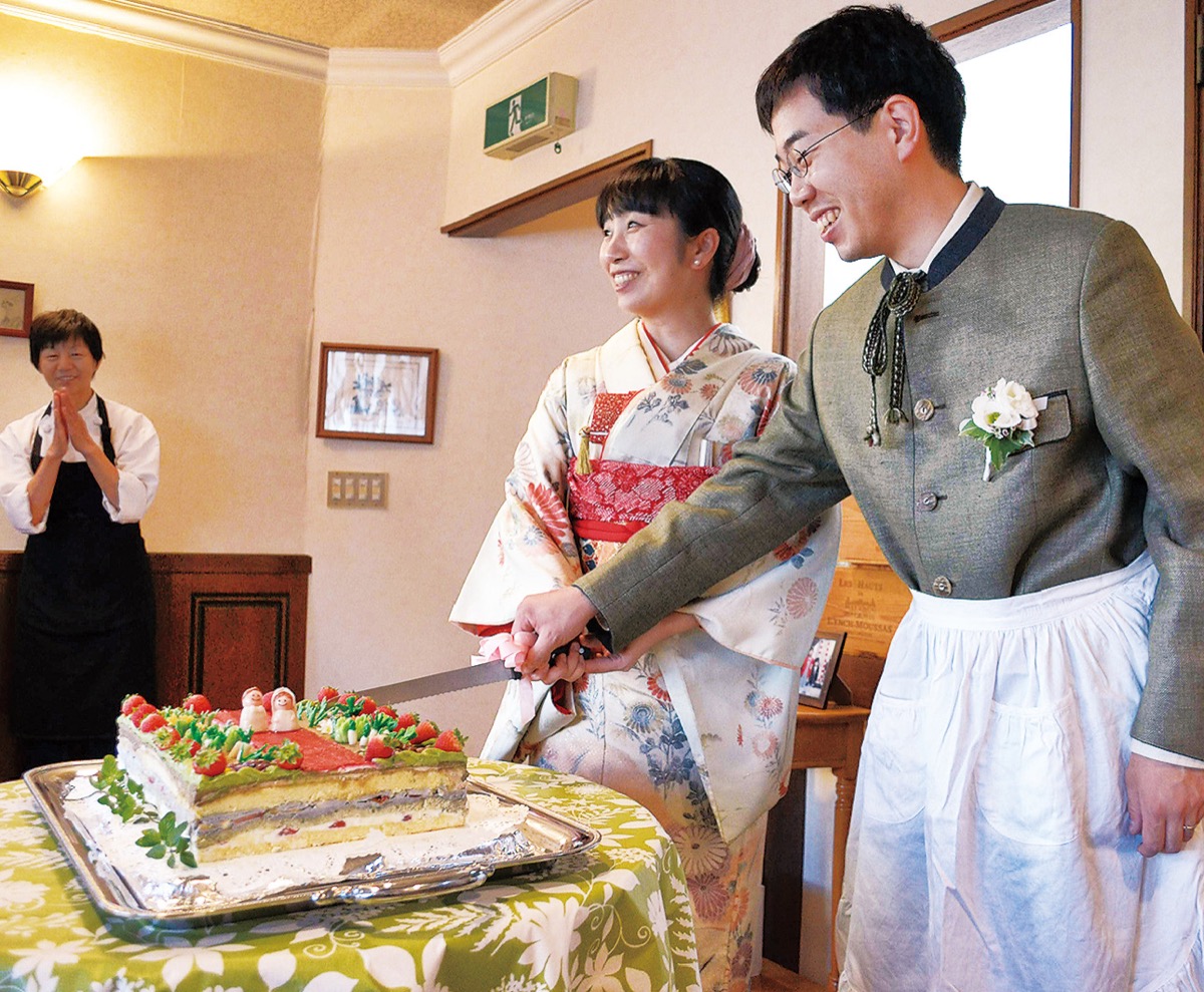 デリスの永田美良子さんと淳一さんの母・幸子さんが高校時代のバスケ部仲間で、淳一さんが幼少期から同店に通っていたことから実現した式。夫婦は一般の式場の形式に違和感を覚え、手づくり感のある式を2人で創りたいと思い、同店での挙式を決めた。式は13日に親族を、19日に友人を招き2回行った。
