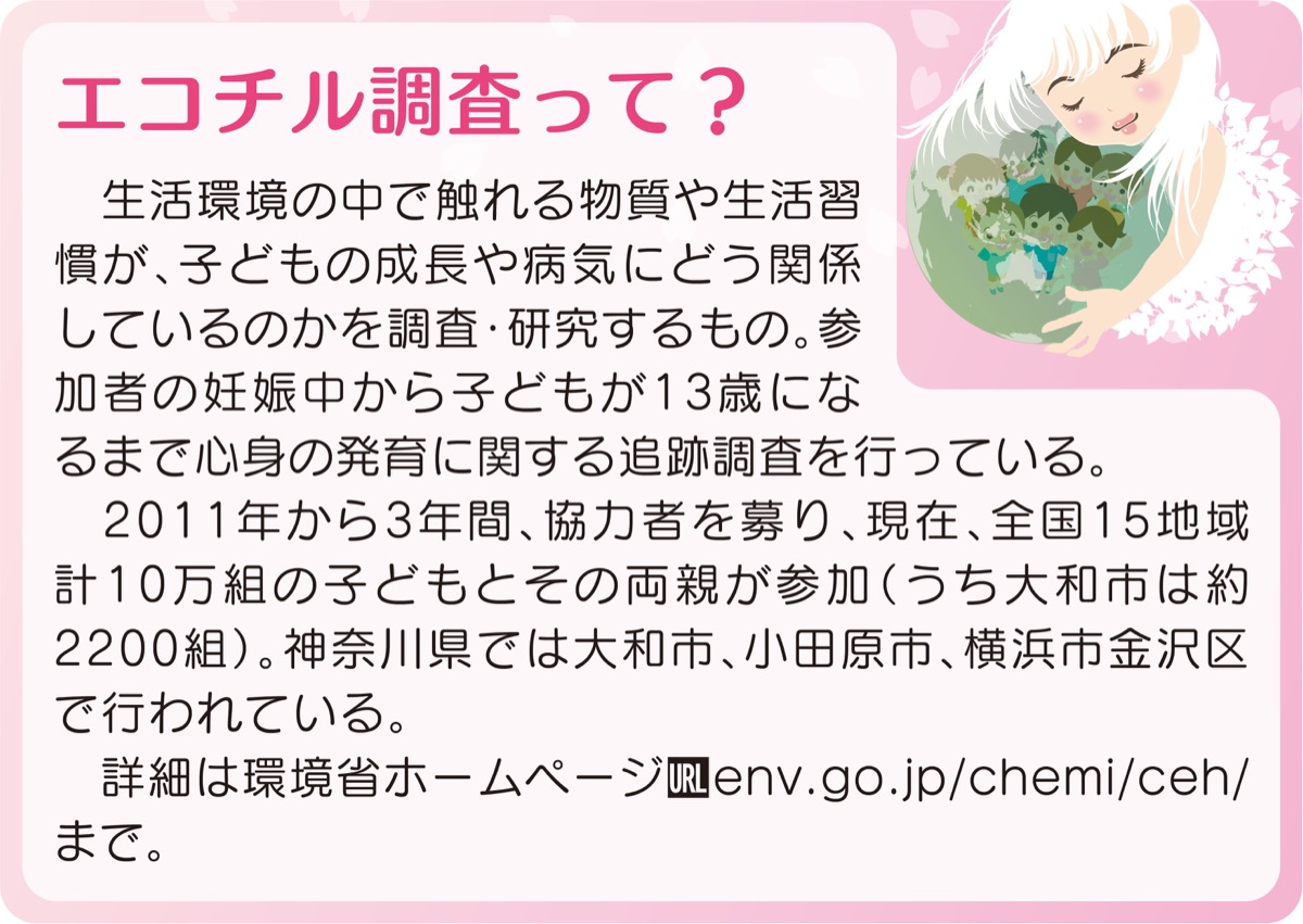 エコチル調査の対象地区の一つである大和市では、約2200人の子どもが調査に協力している。学童期調査は、対象となる小学2年生に今年7月から順次、市役所近くのエコチル調査大和事務所で行われている。