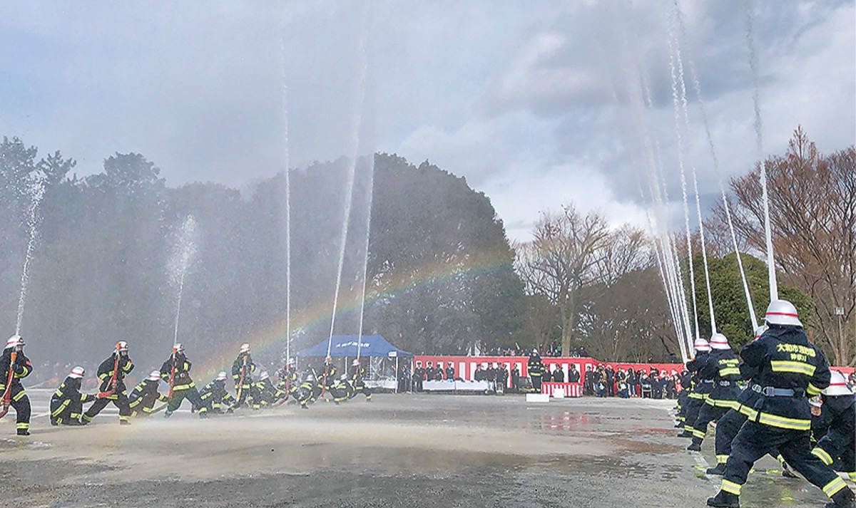 大和市消防出初式が12日、引地台公園令和広場で行われた。式典では消防車両の分列行進や少年消防団、消防署部隊による消防演技が披露され、市内全消防団による一斉放水で締めくくった。