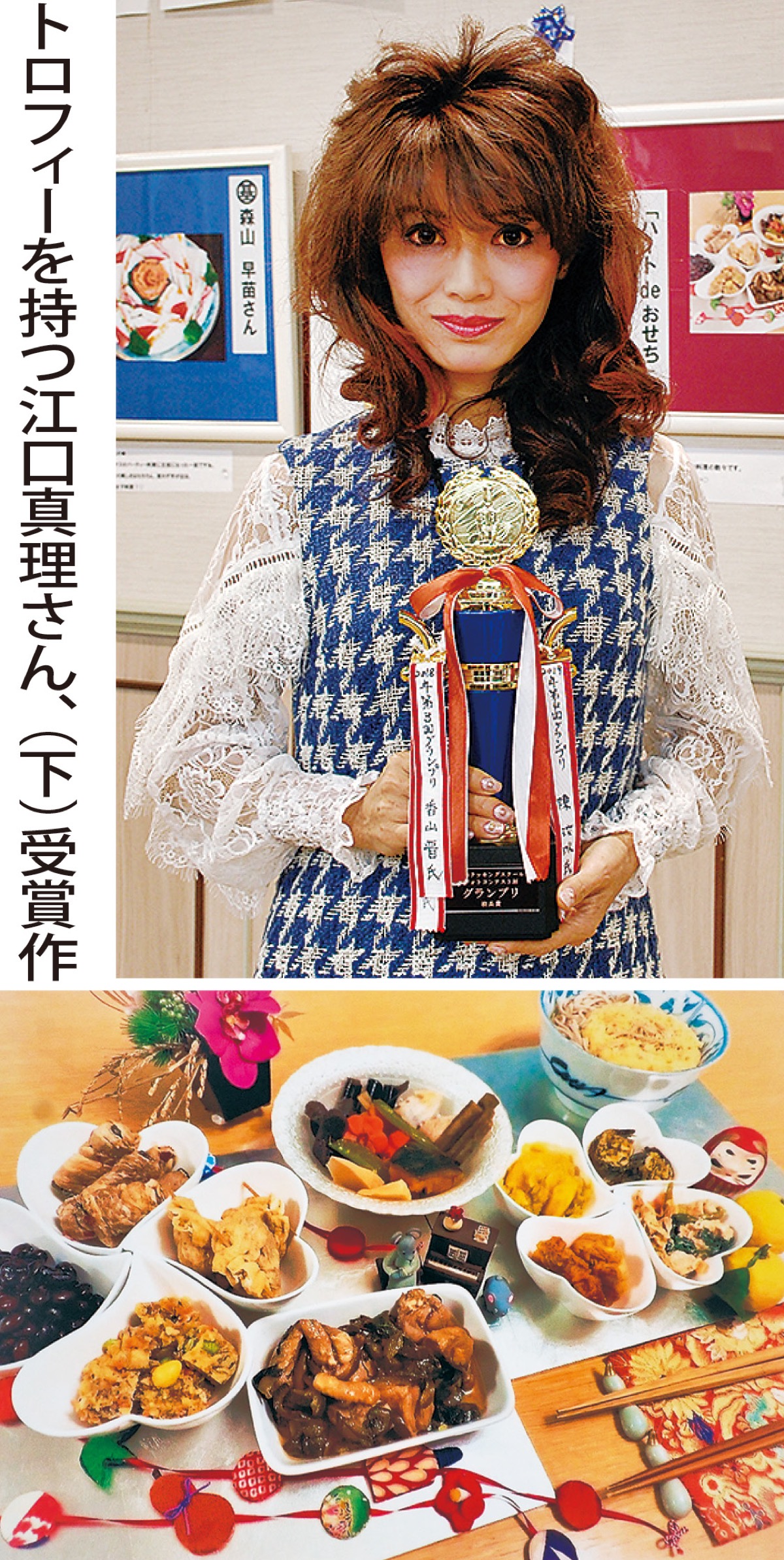 江口さんは、ハート型の皿で可愛らしく華やかに盛り付けた今年のおせちを撮影。黒豆、きんとんのほか、鶏肉となすのマリネ、野菜のごまあえなど彩りや栄養バランスも考えた。干支や花の飾りも自作だという。江口さんは「息子に沢山食べてもらえるよう工夫しました。セッティングが好きで料理教室で色々と学んでいるので、受賞は嬉しい」と喜びを語った。