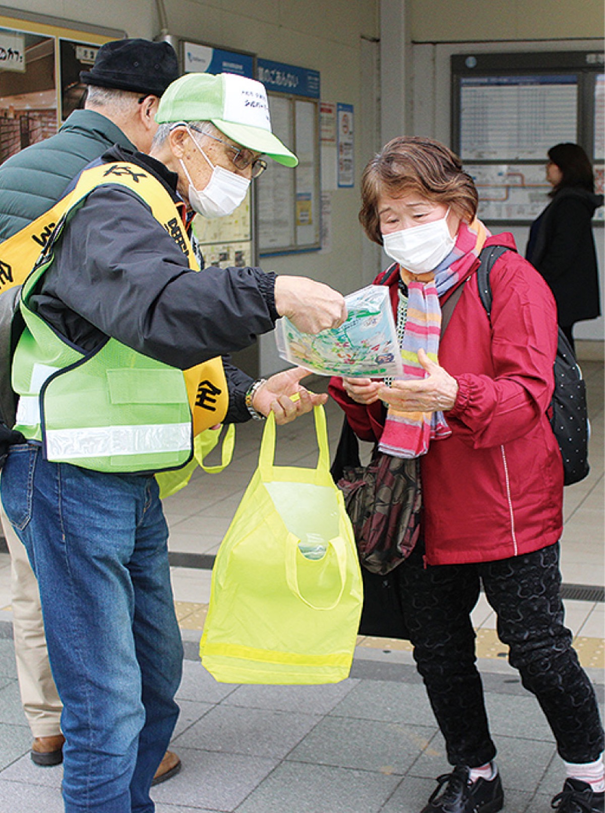 大和市交通安全シルバーリーダー連絡協議会が主催する「シルバー交通安全街頭指導」が今月14日、高座渋谷駅の西口で行われた。これは毎月15日の高齢者交通安全の日に合わせて、年3回市内で実施しているもの。