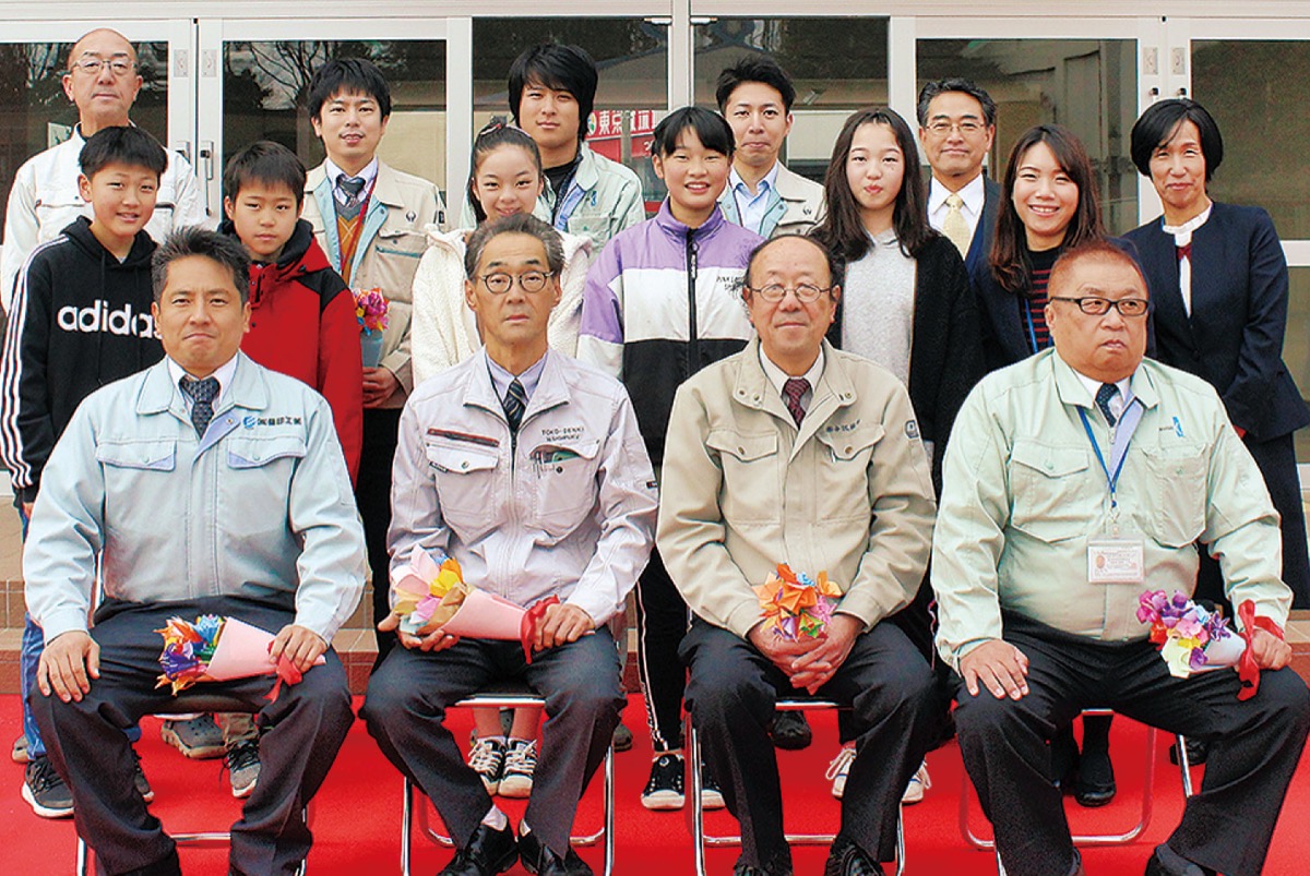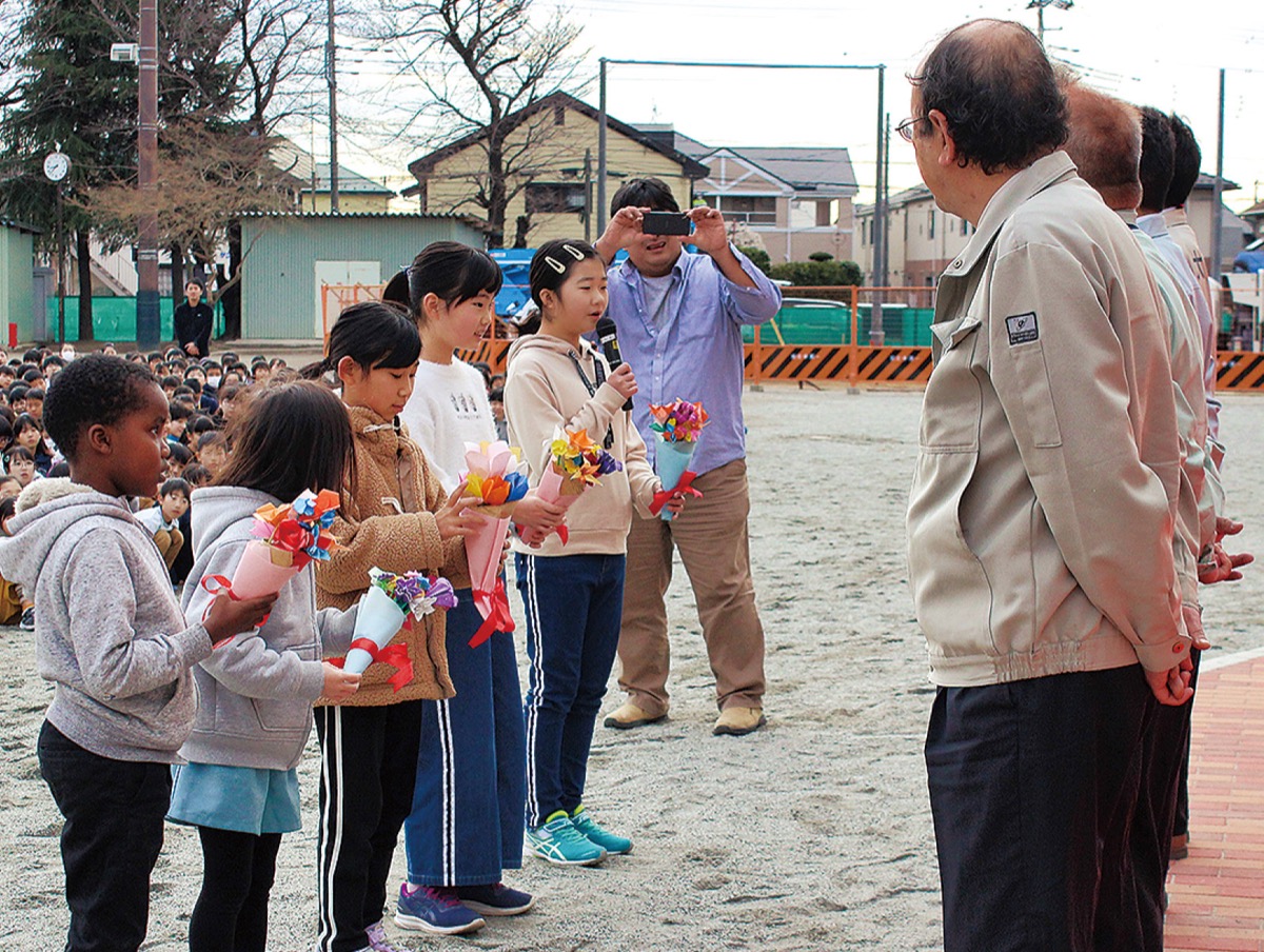 工事関係者に感謝の気持ちを伝えようと児童が中心になって企画したもので、全校朝会の時間で実施。児童らは「素敵な校舎を作ってくれてありがとうございました」などの御礼の言葉と共に、折り紙で作った花束を工事関係者らに手渡した。また、全校児童で米津玄師さんの『パプリカ』を合唱し完成を祝った。