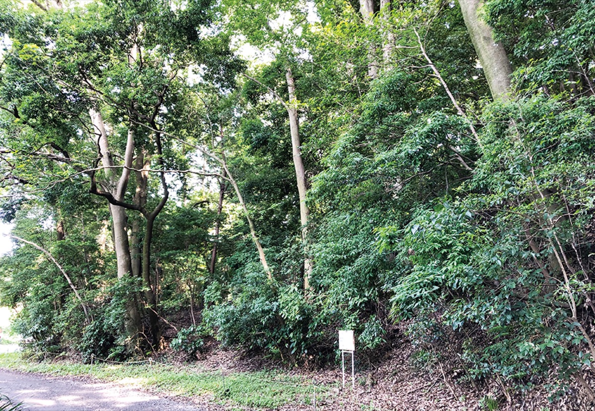 大和のシラカシ林は、田に面した比較的浅い斜面に帯状に存在。広さは1588平方メートル。「かながわの美林50