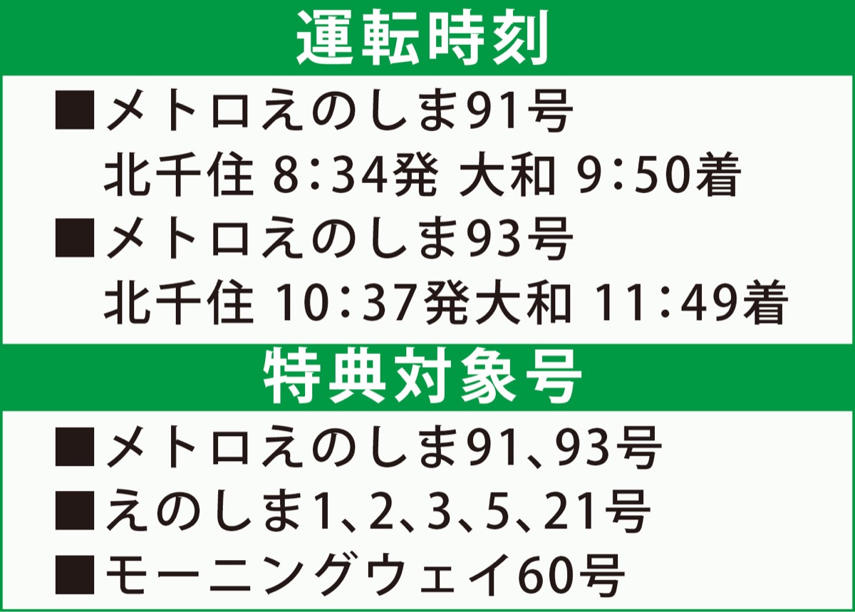 なお両日、始発から午後2時20分までの到着時刻が記載され、大和駅を着駅とした特急券使用者には、ロマンスカーオリジナルノベルティがもれなくプレゼントされる。