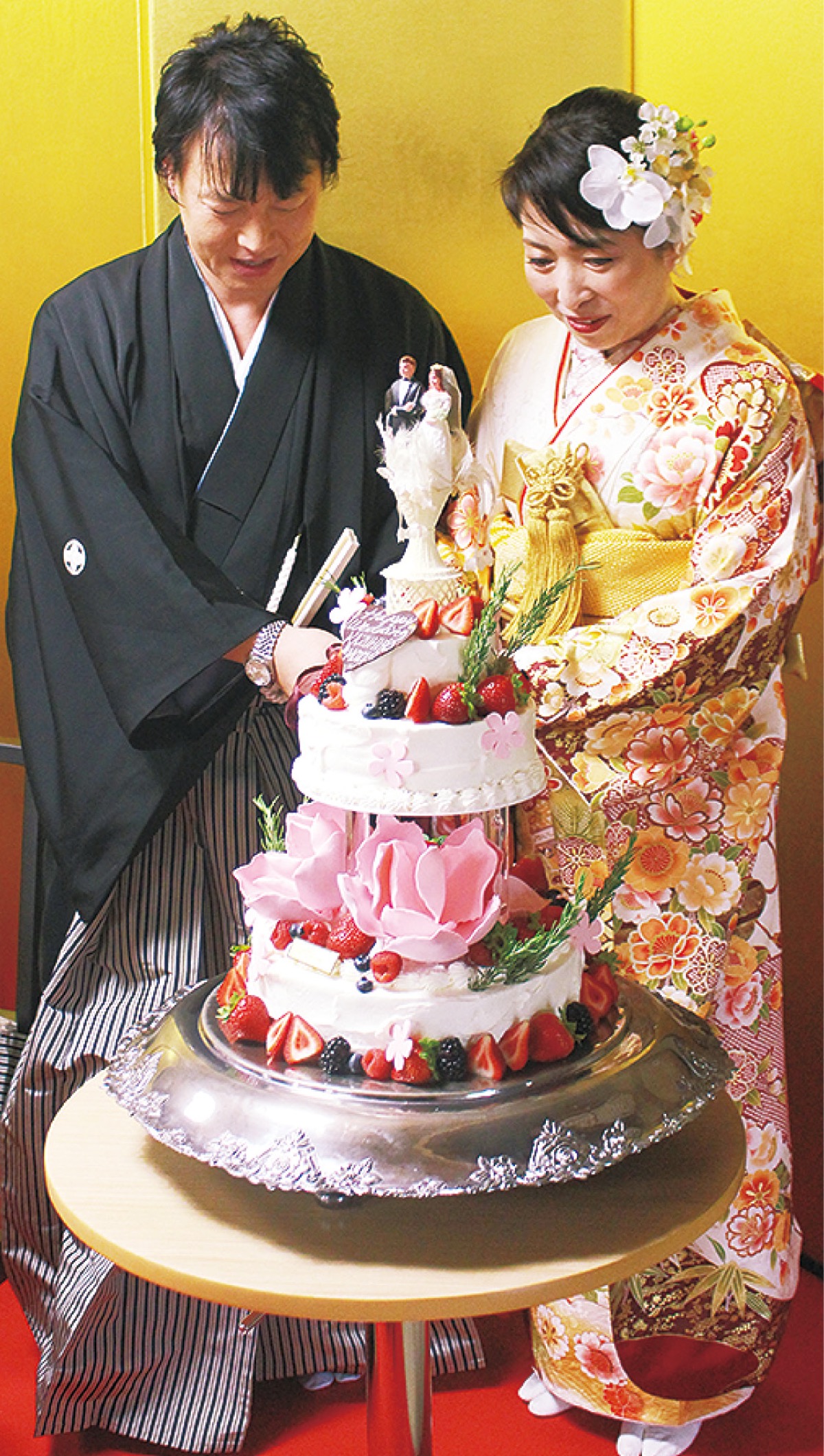 大和市出身の元子さんは、市内のつきみ野幼稚園に勤務していたこともあり、地元・大和にこだわり、ウェティングケーキは桜ヶ丘の「洋菓子の店ミハシ」でオーダー。最後の仕上げは、同寺で行った。また親族の衣装は南林間の「特選呉服こにし」に依頼した。