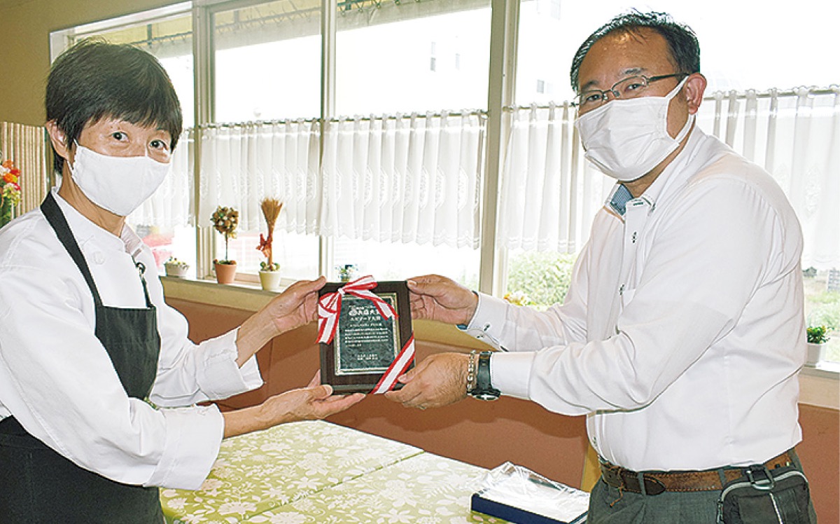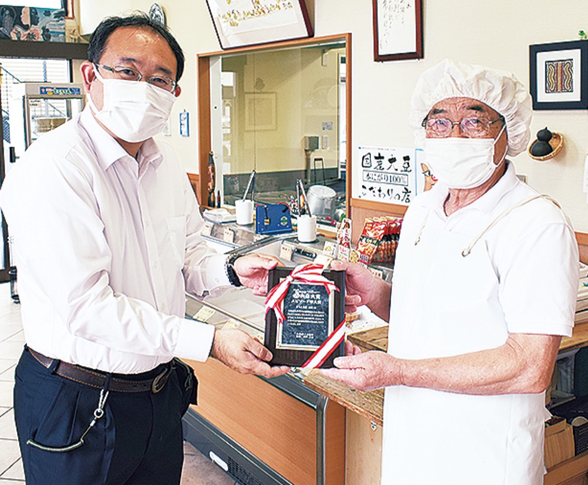 大和商工会議所が主催する「やまと街中お気に入りお店大賞」で、大賞に選ばれた「カフェレストランデリス」と準大賞の「とうふ工房豆畑」に今村豪克実行委員長から盾が贈られた。