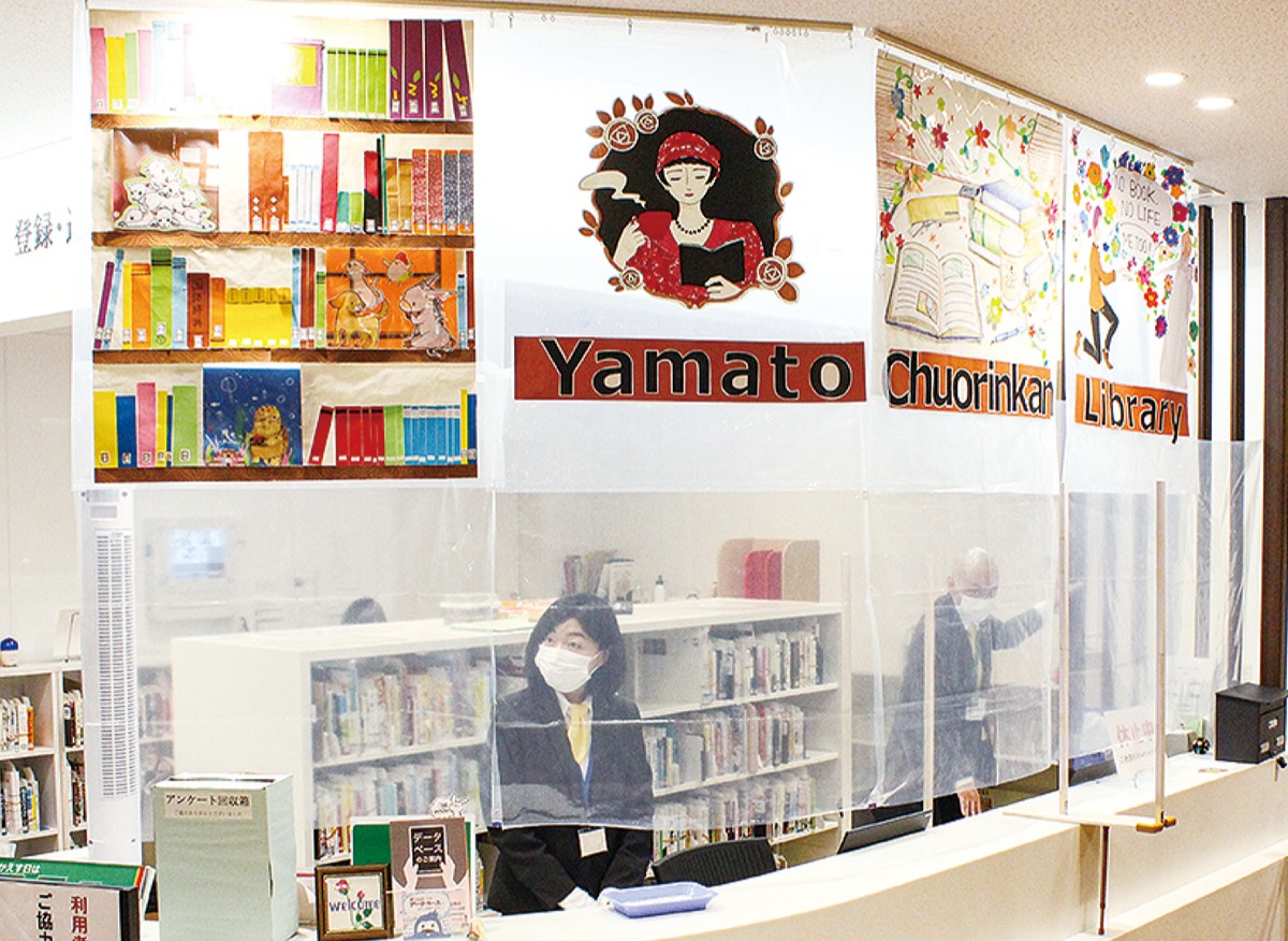 中央林間図書館の受け付けカウンターに、今月から手描きのイラストがあしらわれたビニールカーテンが設置され、利用者を楽しませている。