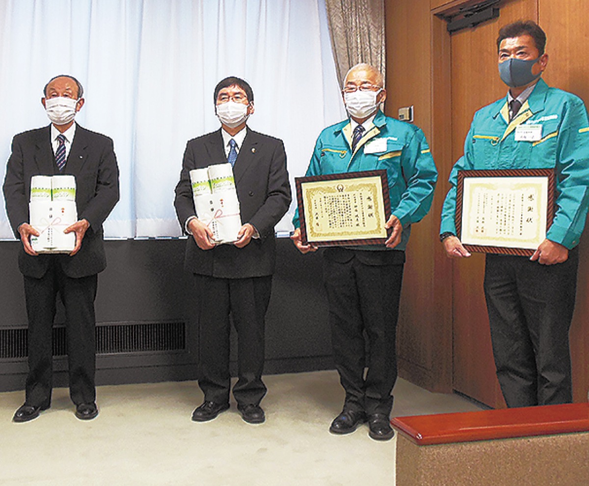 当日は、同組合の神谷代表理事と小俣一之専務理事が市長室を訪れ目録を贈呈、大木哲市長と高橋会長から感謝状を受けた。神谷代表理事は「売上金を市民の皆様に還元できればと思い、寄贈させていただいた。少しでも役立てば」と話した。