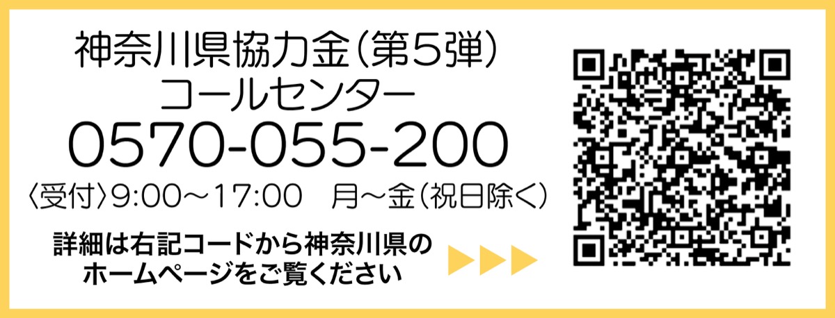 神奈川県では今月19日、夜間営業時間の短縮に伴う協力金(第5弾)について、コールセンターを開設しました。問合せ先を下に掲載しました。ご活用ください。